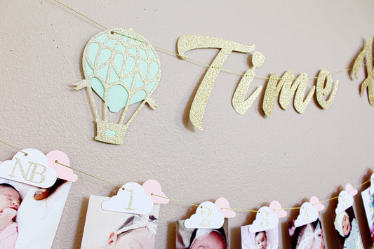 Time Flies 1st Birthday Banner – Customizable Hot Air Balloon Photo Garland – Unique Milestone Party Decoration