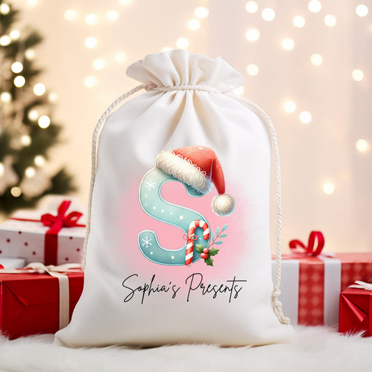 Personalized Christmas Santa Sack with Initial and Name, Custom Holiday Gift Bag for Kids, Reusable Santa Gift Bag, Christmas Present Bag