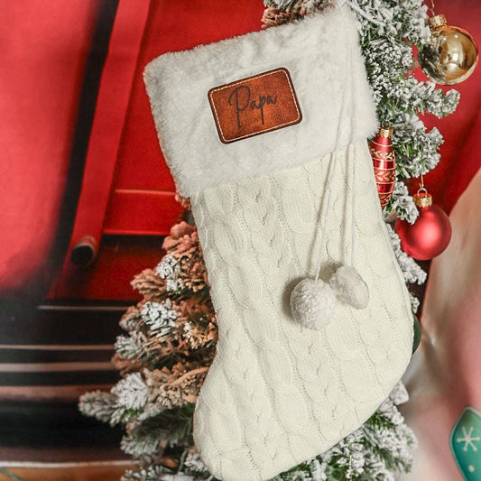 Personalized Cable Knit Christmas Stockings, Custom Stocking with Engraved Leather Patch, Holiday Stocking Gift for Family